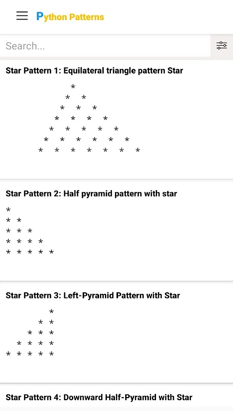 Python Patterns app is loaded with tons of pattern exercises where python programmer can have code for almost any kind of python pattern exercise.