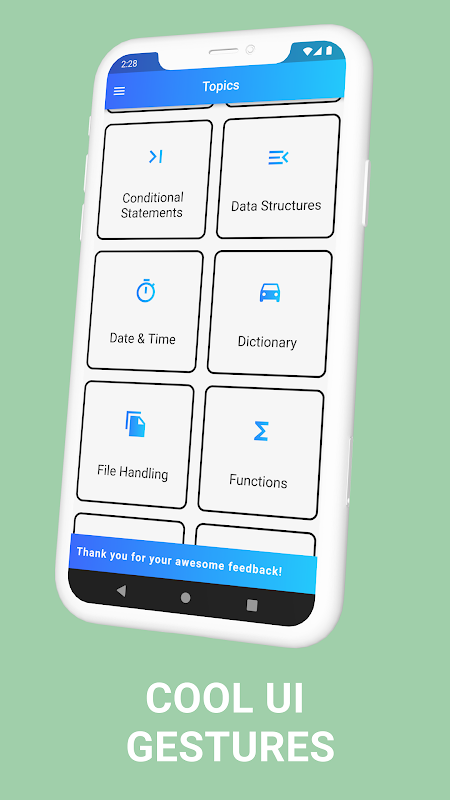 Aplikasi ini memiliki 25+ topik Python dan 1000+ pertanyaan untuk membantu Anda sepanjang perjalanan Anda.
