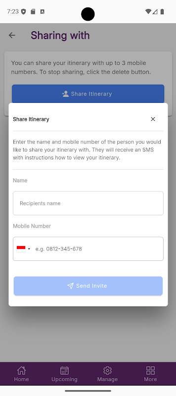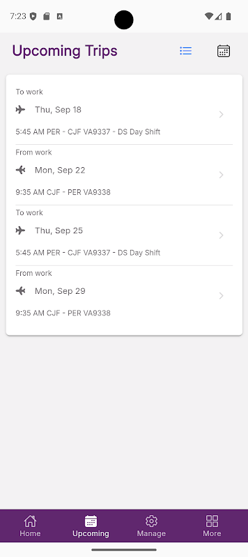 Saat pertama kali menggunakan aplikasi ini, Anda akan diminta untuk mendaftarkan perangkat Anda menggunakan nomor ponsel yang telah Anda berikan kepada Tim Perjalanan SAM Anda. Setelah terdaftar, ada beberapa cara untuk melihat perjalanan mendatang Anda, seperti Kalender dan Daftar Berkelanjutan yang memungkinkan Anda menyesuaikan cara Anda melihat informasi.