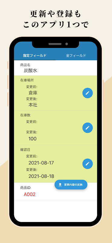 モバイルアプリ上でカメラを起動しkintoneのレコード内容を表示するので、素早く二次元バーコードに関する情報を確認できます。