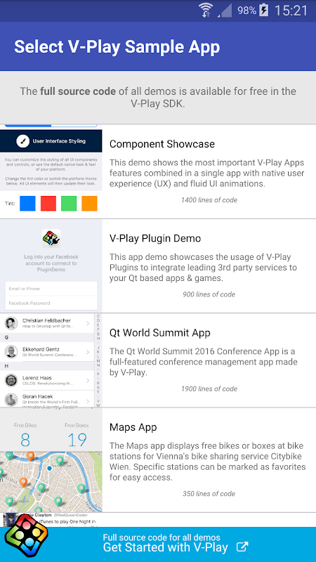 You can browse through all the demos and V-Play features from this single app. The full source code of this Qt Showcase App and all its demos are available open-source in the free V-Play SDK.