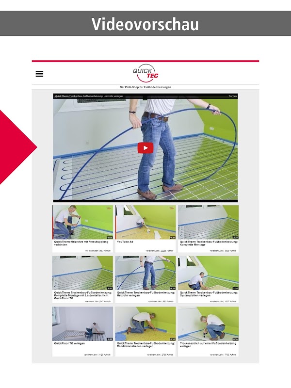 Mit dieser App haben Sie alle Videos zur QuickTherm Fußbodenheizung auf einen Blick. Die Montagevideos lassen sich schnell und einfach während der Verlegung abrufen – und zwar genau dann, wenn sie benötigt werden.