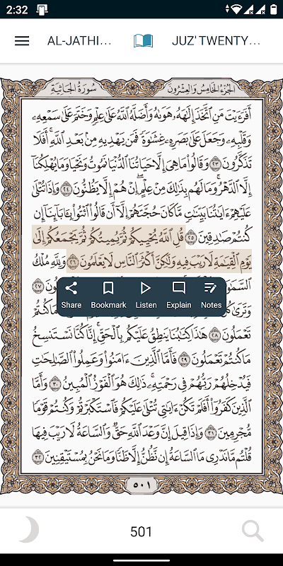 • Kemampuan untuk menyorot ayat-ayat (ayas) untuk menampilkan lebih banyak opsi seperti memutar audio atau menampilkan tafsirnya.