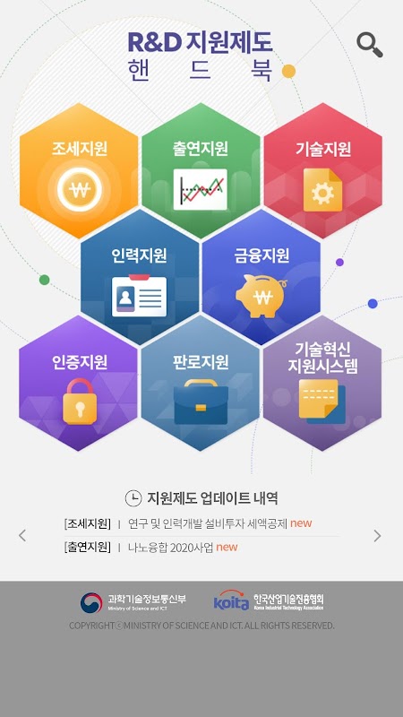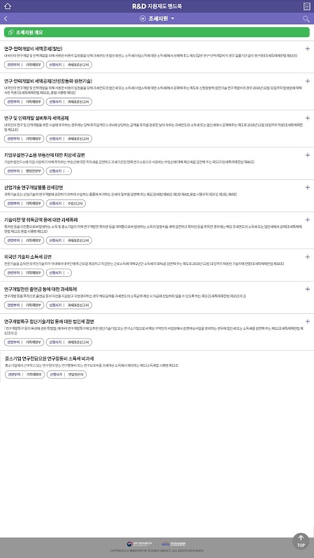 R&D 지원제도 핸드북은 기업의 기술혁신을 지원하기 위하여 정부와 공공기관의 기술개발 관련 지원제도 정보를 종합 제공하고자 조세, 출연, 기술, 인력, 금융, 인증, 판로 등 7개 분야에 대한 지원제도를 요약 정리하였습니다.