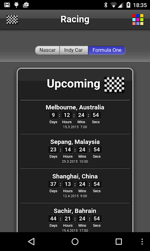Lihat jadwal dan mundur ke mendatang Nascar, Indy dan Formula 1 ras