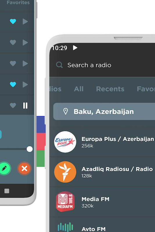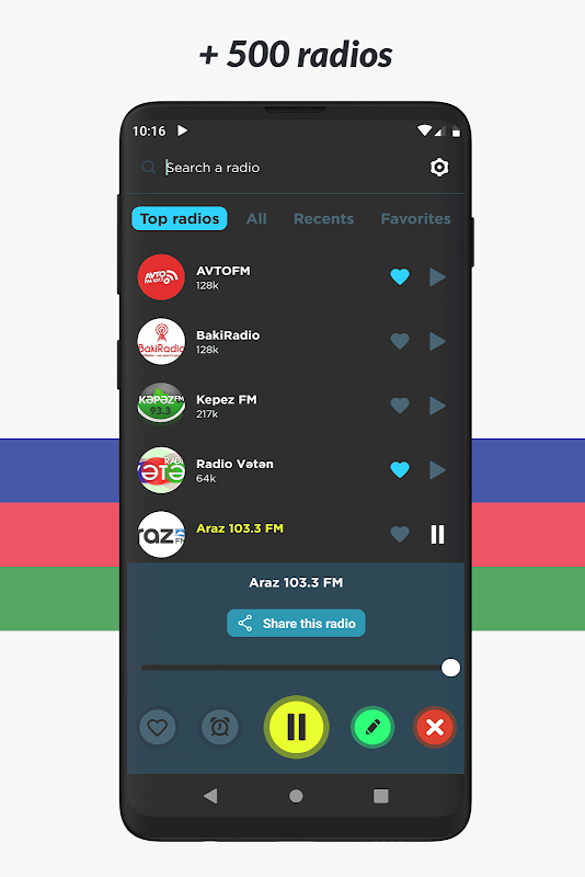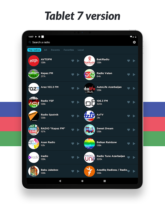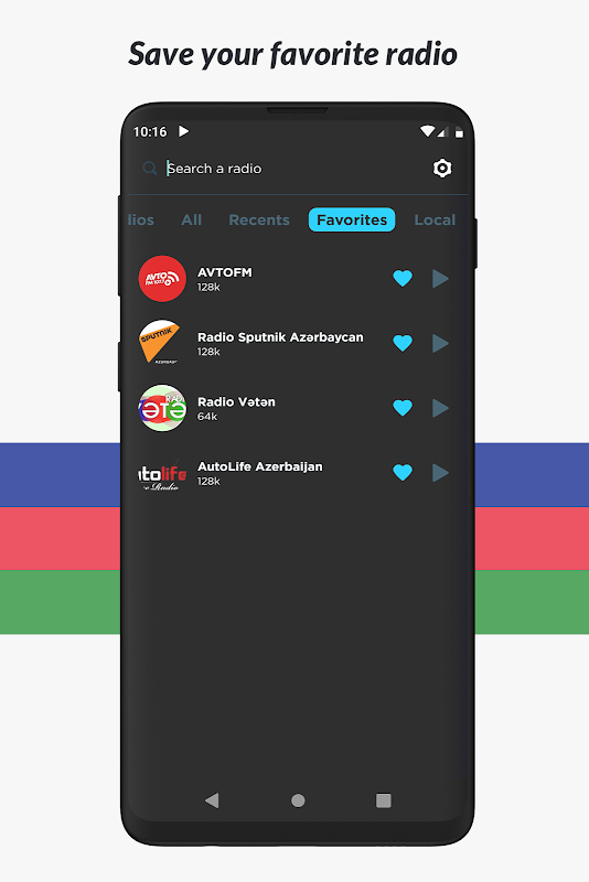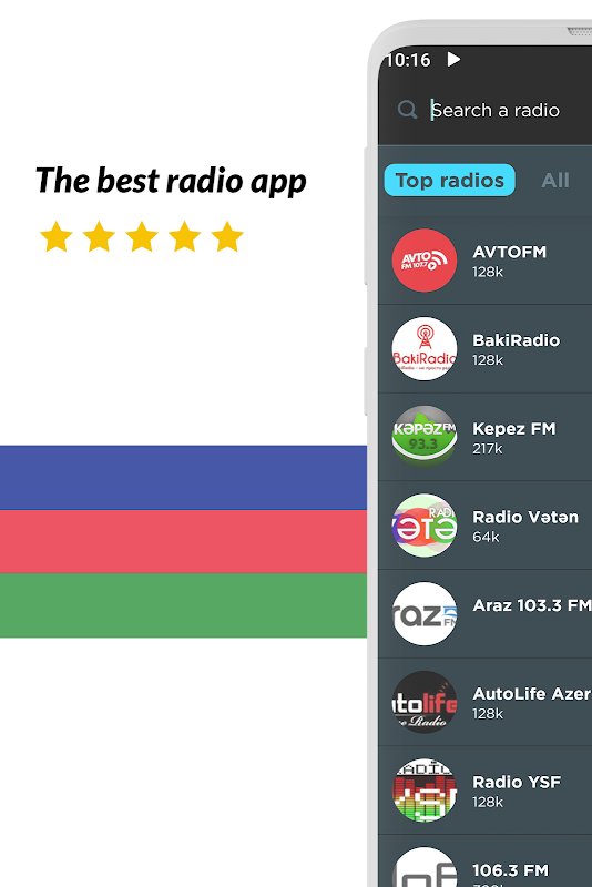 Dengarkan semua stasiun radio favorit Anda seperti Space 104, MIX 3, Naxcivan su 104.1, Jazz.az, Kəpəz 93.3, Vətən, Xoş xəbər, 106, Auto Life, Europa Plus, Baki, Araz 103.3, Sweet Dre, Asan, Balkan Rainbow dan banyak lagi! Dan tidak peduli di kota atau negara mana Anda berada, Anda dapat mendengarkan stasiun radio lokal favorit Anda dari mana saja di dunia!