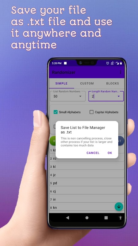 Random Code Generator adalah aplikasi Android untuk menghasilkan angka acak dengan karakter dan penyesuaian pilihan Anda dan juga dengan cara pembuatan kunci produk. Hasilkan kata sandi acak Anda untuk digunakan dengan semua jenis karakter yang Anda inginkan. Anda dapat menghasilkan nomor acak tak terbatas tanpa batas. Simpan seluruh daftar di pengelola file Anda untuk menggunakannya di tempat lain juga.