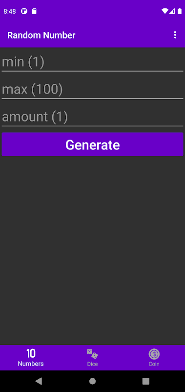 Aplikasi ini menghasilkan angka acak, melempar dadu, dan membalik koin untuk Anda.