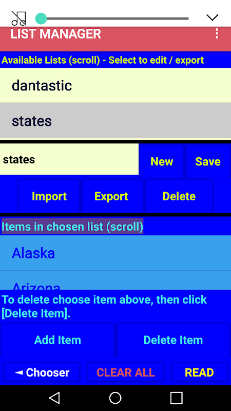 CHOOSER, the random list item picker, has an editor letting you compose and internally store any number of lists as well as importin /exporting them as .txt files to the download folder of your device.