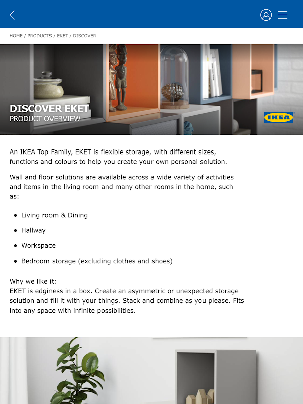 - Galeri: melihat gambar berkualitas tinggi yang diproduksi oleh IKEA of Sweden yang menampilkan produk dari bagian Temukan.