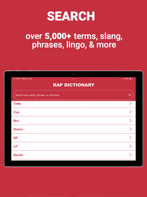Mencoba mempelajari lebih lanjut tentang musik Rap & Hip Hop? Kalau begitu, aplikasi ini cocok untuk Anda! Unduh aplikasi Rap Dictionary untuk akses tak terbatas ke istilah-istilah rap kapan pun dan di mana pun Anda membutuhkannya. Sekarang Anda tahu apa arti kata dalam lagu itu.