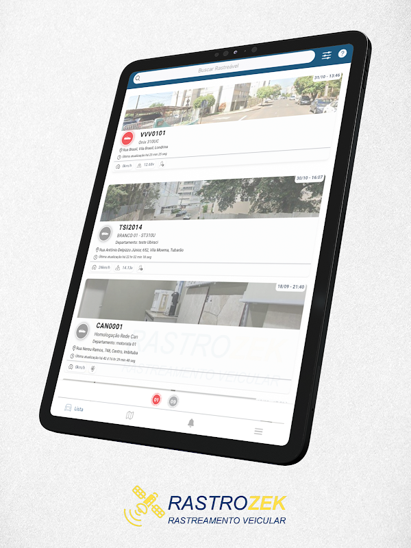 Daftar lengkap yang dapat dilacak secara real time, dengan alamat lokasi dan kecepatan. Dijumlahkan dan dipisahkan berdasarkan status, memungkinkan Anda mengidentifikasi mana yang onLine, offLine, bergerak atau berhenti, dengan kunci kontak hidup atau mati.