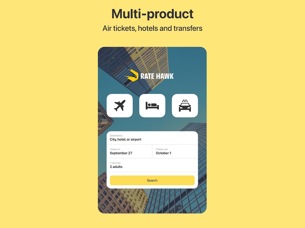 RateHawk es una plataforma online untuk reservasi hotel, billetes de avión y alquileres de coches, así como para gestionar otros servicios de viajes. Esta solución para profesionales de los viajes está presente en 101 mercados y 14 idiomas.