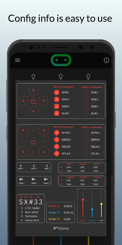 Aplikasi kami menawarkan serangkaian opsi kontrol yang komprehensif untuk memenuhi semua kebutuhan Anda. Ini memiliki delapan tombol, tiga sakelar atau sakelar, dan tiga penggeser, masing-masing menawarkan cara unik untuk berinteraksi dengan Micro:bit Anda. Nilai dan batasan bilah geser dapat dengan mudah disesuaikan agar sesuai dengan kebutuhan spesifik proyek Anda. Selain itu, tiga lampu tersedia untuk pemantauan jarak jauh, mengikuti jalur, atau tujuan debugging, memberikan umpan balik visual secara real-time.