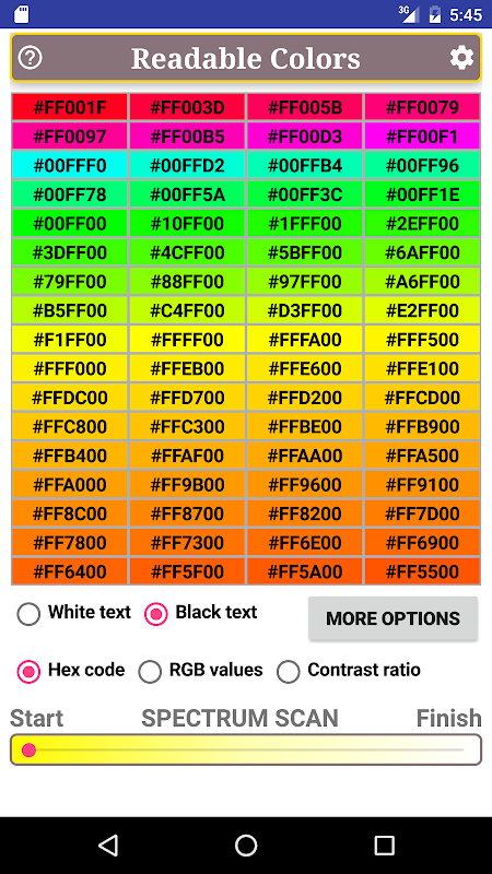 This app uses the W3C formula to help you find background colors for black and white text. You can quickly scan through virtually all available colors within the specified minimum standard. These colors you can sort by hue, by saturation, or by brightness in the HSV color system. This app also shows you either the Hex color code, or the RGB values, or the contrast ratio for all available colors.