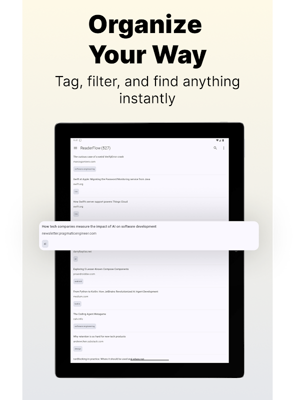 Beri tag dan kategorikan artikel sesuai keinginan Anda. Gunakan tag khusus untuk mengatur berdasarkan topik, prioritas, atau sistem apa pun yang sesuai untuk Anda. Pencarian teks lengkap memungkinkan Anda langsung menemukan artikel tersimpan, bahkan berbulan-bulan kemudian.
