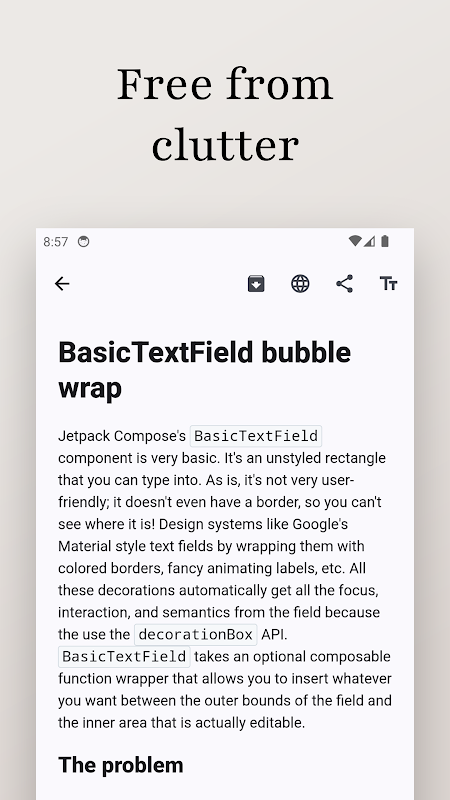 Aplikasi ini menawarkan pengalaman membaca yang bersih dan bebas gangguan dengan menyingkirkan kekacauan yang tidak perlu, hanya menyisakan konten yang penting, semuanya dilakukan secara lokal di perangkat Anda. Data bacaan Anda tidak pernah meninggalkan perangkat Anda.