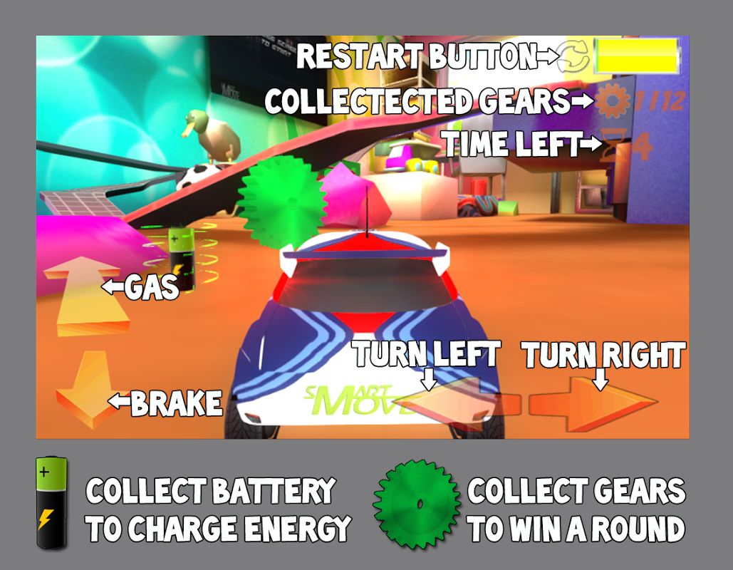 Buka trek untuk mesin mikro Anda dengan banyak rintangan dalam bentuk detail interior, dekorasi, mainan, dan lainnya! Levelnya tidak terbatas pada trek, kamu bisa pergi ke mana saja! Untuk menyelesaikan level, kamu harus mengumpulkan semua detail RC, yang tersembunyi di sekitar level game.