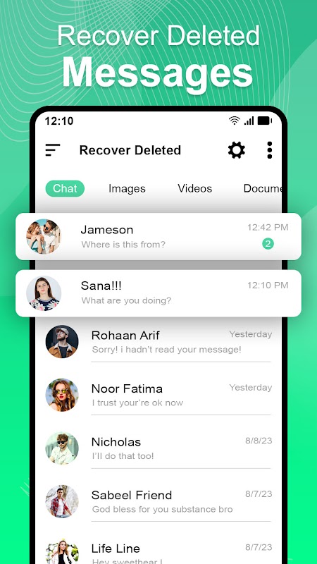 Aplikasi pemulihan pesan memungkinkan Anda menyimpan status teman Anda. Pulihkan pesan yang dihapus, beri tahu Anda segera saat pemulihan pesan yang dihapus mendeteksi penghapusan data. Pemulihan Teks untuk Pemulihan otomatis pesan yang baru saja dihapus. Aplikasi pemulihan data adalah jawaban lengkap tentang cara membaca pesan yang dihapus. Aplikasi pemulihan pesan yang dihapus memungkinkan Anda melihat status yang diinginkan dan menyimpan status video dan foto ke galeri Anda. Pulihkan pesan dan media bisnis juga merupakan unduhan status yang merupakan paket lengkap untuk bisnis WA & WA Anda.