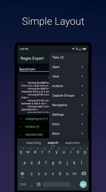 Pencari Ahli Regex adalah aplikasi yang menggunakan ekspresi reguler untuk mencari di beberapa file teks. Dapat juga digunakan sebagai penguji regex, tempat Anda memasukkan beberapa teks dan mencocokkannya dengan suatu pola. Aplikasi pencari file ini juga memungkinkan seseorang untuk mengganti kecocokan yang ditemukan di semua file dengan teks pengganti dan menyimpannya di file baru. Pencari RegEx menggunakan mesin Java dan JavaScript untuk melakukan pencarian. Navigasi efisien dalam aplikasi pencari file ini karena seseorang hanya perlu menggesek untuk pindah ke tab berikutnya atau sebelumnya. Ini juga memiliki fitur unik yang disebut pencarian regional dengan memungkinkan seseorang untuk memilih hanya ramuan teks dalam file yang akan dicari menggunakan ekspresi reguler. Dimungkinkan juga untuk memfilter beberapa grup tangkapan tertentu agar tidak terlihat di pertandingan dan juga dalam penggantian. Pencarian Reg Ex juga memungkinkan seseorang untuk menyimpan pola untuk penggunaan di masa mendatang. Aktifkan pencarian otomatis untuk mencocokkan ekspresi reguler saat Anda mengetik. Aplikasi pencarian regex untuk android juga memiliki lembar contekan untuk melihat ke bawah karakter meta, pengubah, dan penghitung.