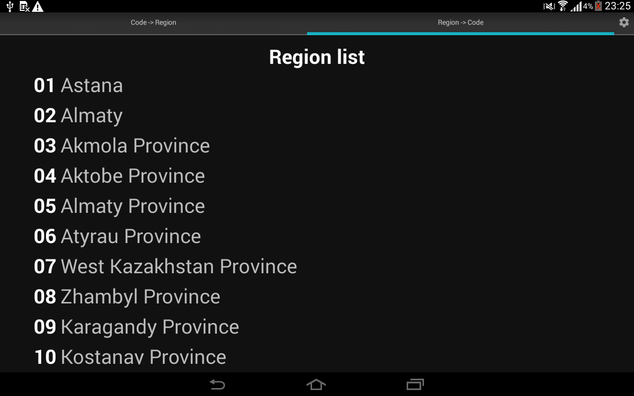 Application helps to determine a region of Kazakhstan by a code given on a vehicle registration plate. With just a few clicks you will find the code corresponding to the province of Kazakhstan.