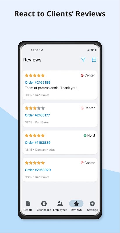 Tetap dapatkan informasi tentang umpan balik pelanggan dengan mengakses tab Ulasan. Di sini, Anda dapat melihat skor dan komentar tentang layanan Anda untuk periode apa pun. Jika Anda memiliki pertanyaan tentang ulasan tertentu, klik nomor pesanan untuk membukanya di versi web Aplikasi RO. Tekan lama kartu ulasan untuk menghubungi klien atau manajer perintah kerja.