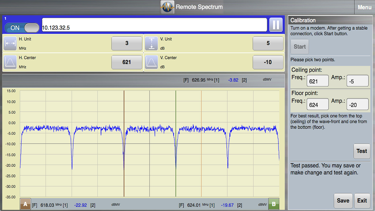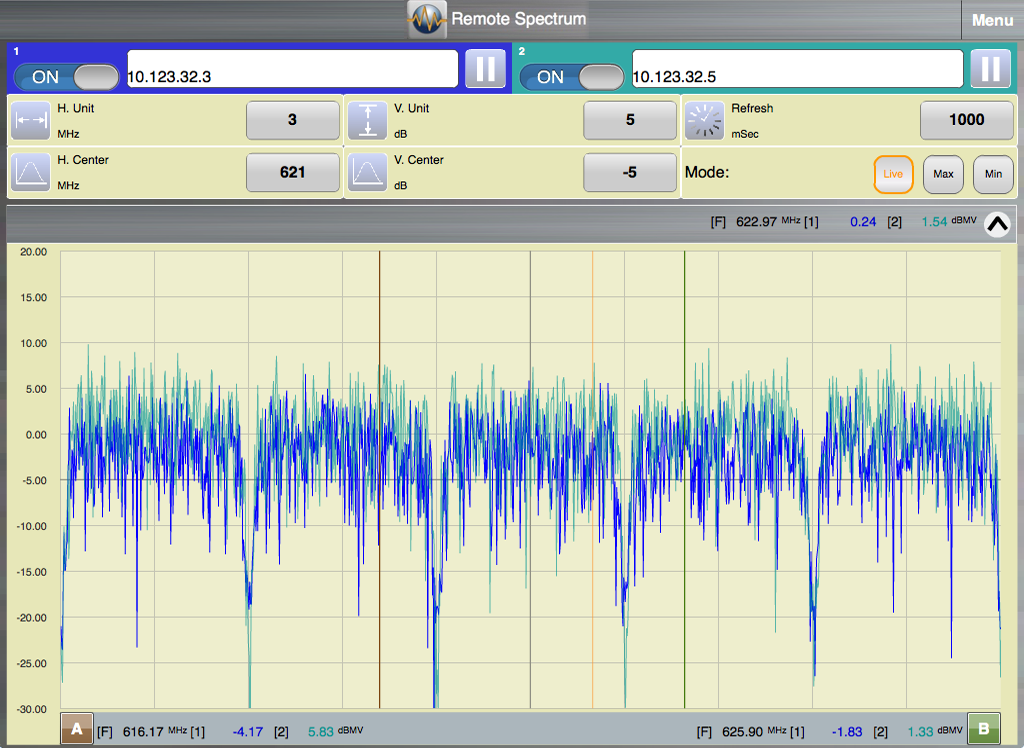 Dengan Remote Spectrum Anda tidak perlu roll truk ke rumah pelanggan untuk melihat spektrum penuh. Anda dapat melihat semua saluran video dan data tanpa berada di lokasi pelanggan, dan tanpa menghubungkan meter, terlepas dari apa saluran perangkat disetel untuk. Terpencil Spectrum mengumpulkan data spektrum dari setiap CPE yang kompatibel dan menampilkannya pada tablet atau smartphone dimanapun Anda berada. Anda juga dapat overlay sinyal RF dari perangkat CPE kedua sehingga Anda dapat membuat perbandingan cepat spektrum di dua titik yang berbeda pada tanaman kabel.
