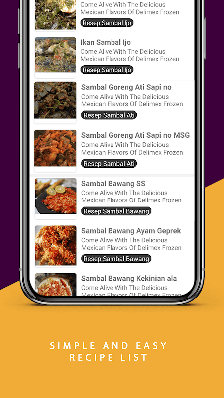 Dalam aplikasi ini tersedia berbagai resep sambal Nusantara dengan variasi dan langkah-langkah yang jelas dan mudah untuk diikuti tentunya sangat bisa dipraktekkan bahkan untuk pemula yang baru belajar memasak (rumahan maupun untuk jualan).