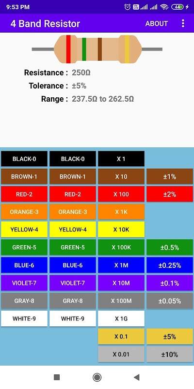 Aplikasi ini dapat menghitung Band_3, Band_4, Band_5, Band_6, SMD 3 digit 4 digit dan resistor EIA-96.