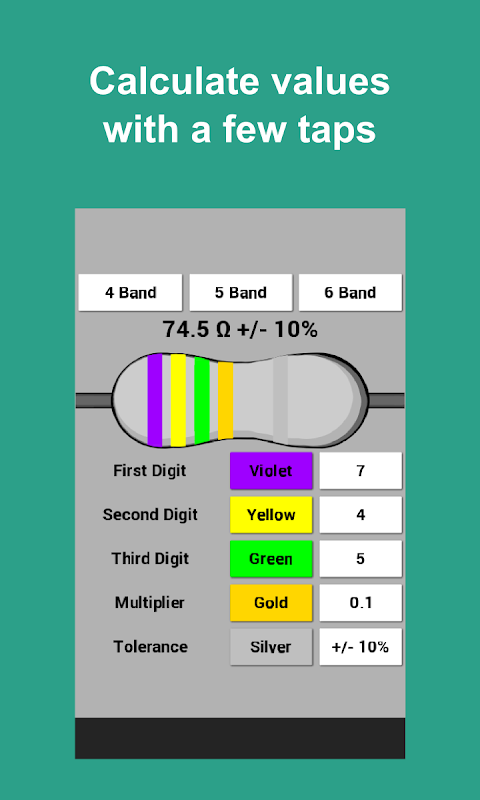 With a few simple taps select the colors appearing on your resistor to determine its resistance value. Or, alternatively, select the desired resistance values to see the associated color bands.