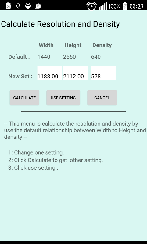 - This app can calculate the Resolution and Density when you change one setting with default relationship.