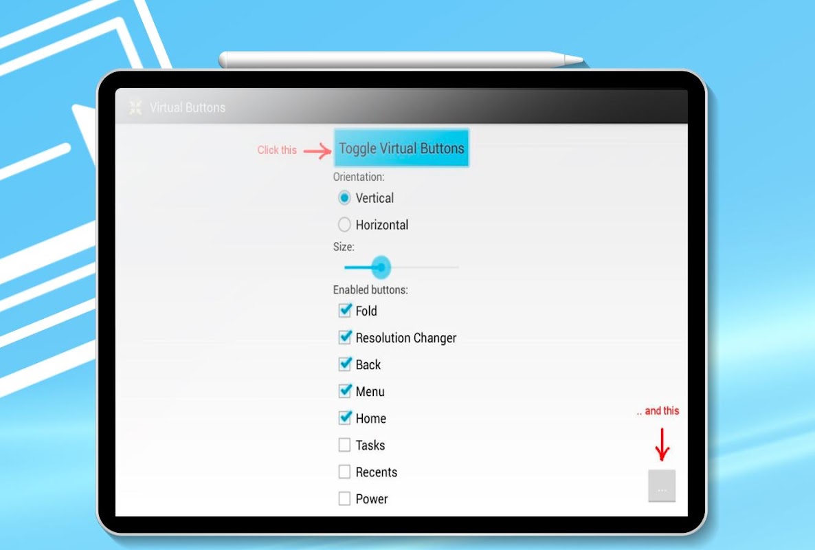 - If your device doesn't have hardware buttons and depends on on-screen controls, the controls may have problems on certain resolutions. They may appear in both portrait and landscape orientations or only one of them. Try increasing the size of the smaller dimension a bit and they should appear in both orientations. Otherwise, you can just enable the virtual buttons and ignore the entire problem.