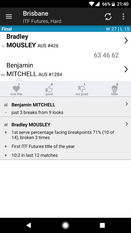 Resultina meliputi ATP, WTA, ITF dan yunior ITF hasil. Semua informasi dalam satu aplikasi.