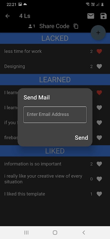 After deciding the template, the facilitator got generated room code by system. The facilitator can share and invite room with teammates via code. The facilitator can give feedback by using plus (+) button as a team member. The other team members can join room easily with room code. Enjoy with adding comments under subjects of the template as anonymous! When all comments are completed, everybody can vote comments by clicking heart icon. End of the meeting, everyone can save output of the meeting and its comments on their local phone. 5 template notes can be saved and viewed by clicking History button.