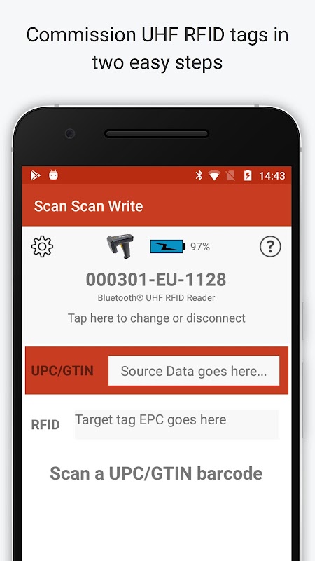 RFID Scan Scan Write dirancang untuk memberi tag UHF RFID dengan cepat dengan standar industri dan EPC khusus. Aplikasi dapat mengambil informasi kode batang GS1 dan kemudian menyandikan tag dengan GS1 yang sesuai dengan GS1 SGTIN-96, GRAI-96 atau GIAI-96 atau menggunakan data Pindai Hex / ASCII yang dipindai secara langsung untuk menghasilkan nilai EPC khusus. Tag juga dapat dikunci dan kata sandi ditentukan sehingga dijamin aman terhadap modifikasi yang tidak diotorisasi.