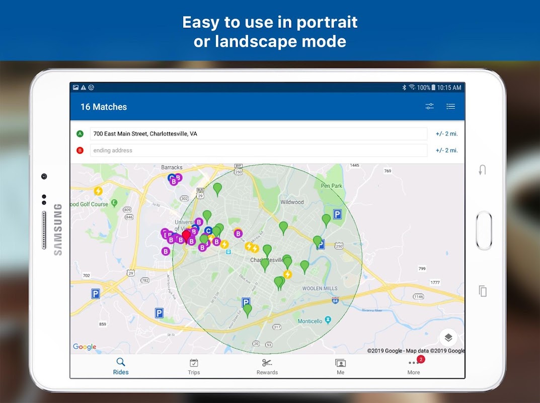 Use the RideShare app to find rideshare matches and earn rewards in the greater Charlottesville, VA area.