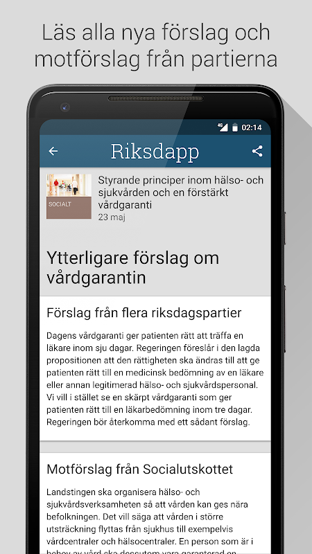 Med Riksdapp får du möjligheten att enkelt följa det som händer i Sveriges riksdag och hålla dig uppdaterad med nyheter inom svensk politik. Du får en notifiering när nya beslut har tagits i riksdagen för att direkt kunna ta del av förslag och motförslag från involverade partier, utskott samt regeringen.