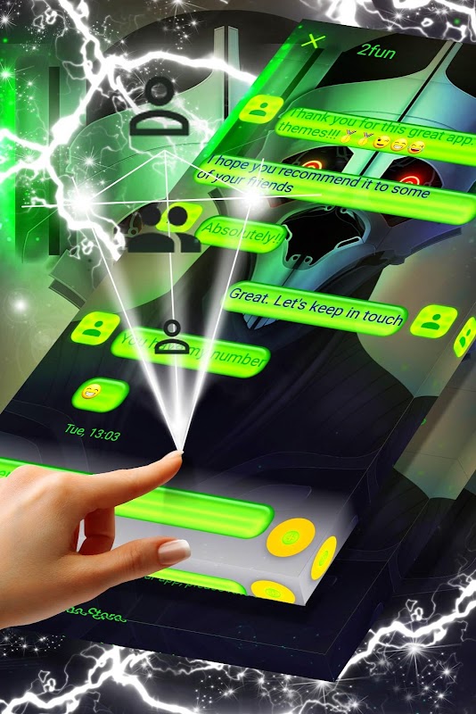 This custom SMS theme works with the some of the most popular SMS apps. If you don't have a compatible app installed on your device, don't worry at all. Our SMS themes free will safely tell you the easy steps to obtain one of them! When you open Robot Mask SMS Theme you will receive complete instructions to download it.