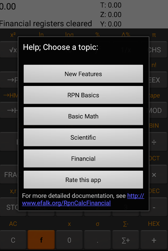 RpnCalc Keuangan adalah full-fungsi kalkulator keuangan diprogram sangat serbaguna. Ini termasuk matematika, keuangan, dan fungsi statistik.