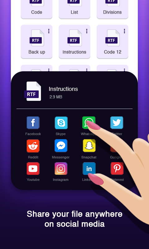 Pengguna di pembaca dokumen dapat melihat file yang dapat dibaca melalui penampil dokumen yang menampilkan slide lembar halaman kata file RTF & file Xls juga. Penampil File RTF mencantumkan semua file RTF di penampil file RTF melalui pembaca file RTF untuk android. Dalam Penampil file, pengguna dokumen kaya dapat dengan mudah melihat semua file RTF tanpa gangguan apa pun. Sebagai pengguna pembaca file RTF untuk android, Anda dapat membagikan file RTF kantor dalam hal doc, docs, Docx, atau dokumen lain sebagai pembaca kantor dalam hal halaman format kaya format file dalam penampil RTF Pembaca file RTF untuk android .
