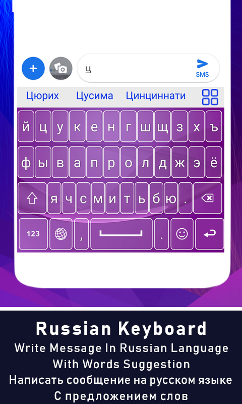 Keyboard Rusia Berwarna-warni memiliki opsi 'Simpan Kata' & 'Font Teks' tambahan.