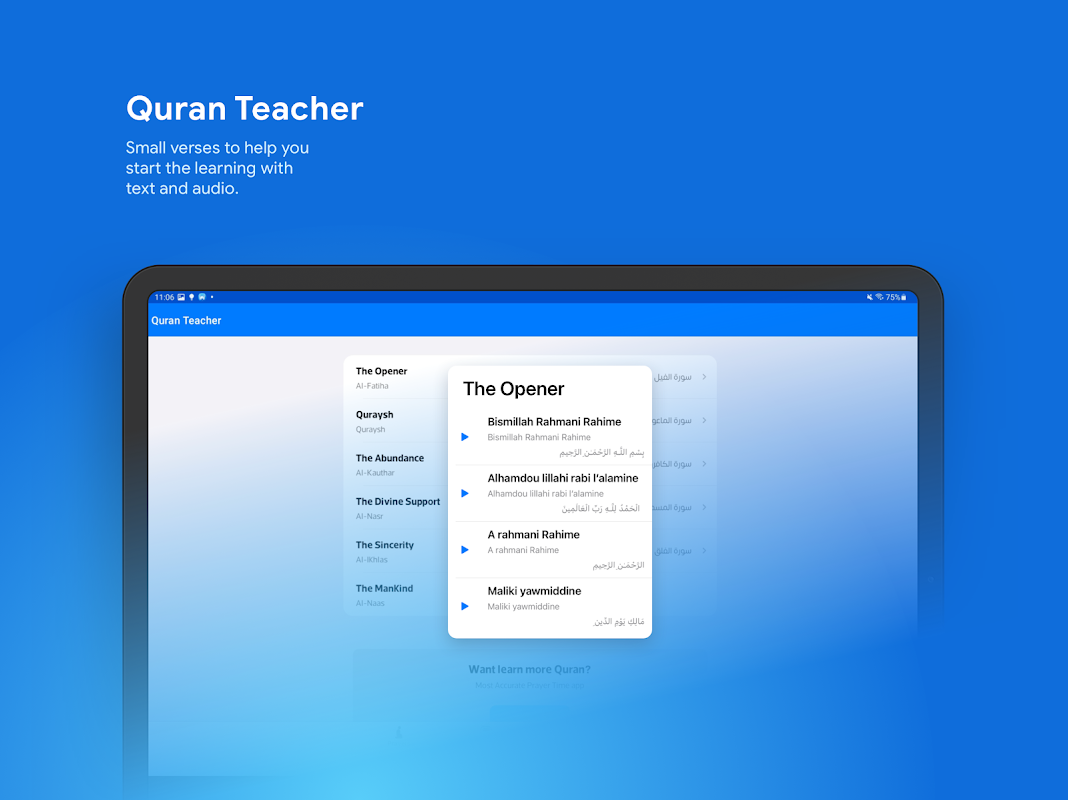 Panduan ini insya Allah akan membantu Anda untuk meningkatkan shalat Subuh, Dhurh (Zuhr), Ashar, Maghrib, dan Isya. Pembacaan audio Alquran yang jelas juga membantu Anda meningkatkan pengucapan Anda.