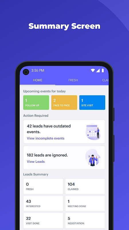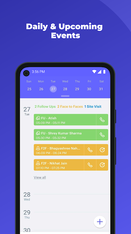 Aplikasi Penjualan memberdayakan Agen Penjualan dengan memungkinkan mereka untuk mengelola prospek dan kegiatan sehari-hari mereka. Ini dirancang untuk karyawan saat ini menggunakan pengalaman mobile-only dan mudah digunakan. Ini memungkinkan agen penjualan untuk menindaklanjuti dengan klien, mengelola panggilan di telepon dan web, deteksi id pemanggil masuk berdasarkan pelanggan yang ditugaskan dan mengotomatiskan tugas berikutnya berdasarkan status panggilan (durasi waktu, terhubung, ditolak, berhasil) dengan pelanggan.
