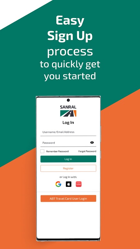 Harap dicatat bahwa jika Anda sudah memiliki akun SANRAL Anda tidak perlu mendaftar lagi untuk menggunakan Aplikasi ini, cukup gunakan kredensial Anda yang ada untuk masuk (detail yang sama yang Anda gunakan untuk situs web SANRAL).