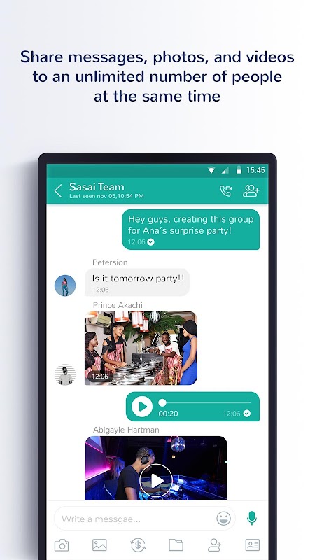 Fasilitas obrolan yang mudah digunakan: Dengan Obrolan Sasai, Anda mendapatkan pesan tanpa batas, panggilan suara dan video ke teman dan keluarga di seluruh dunia.