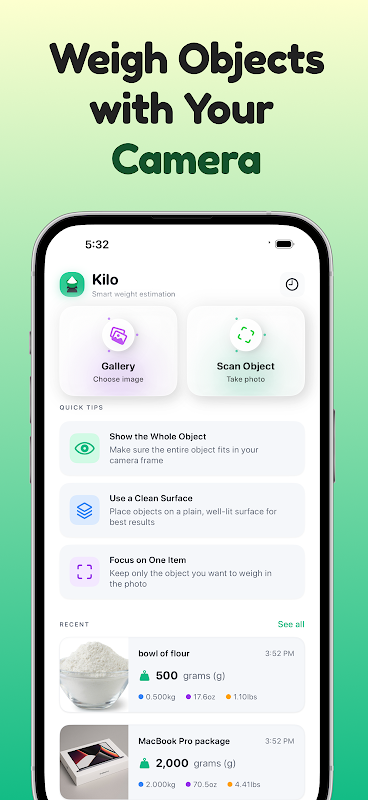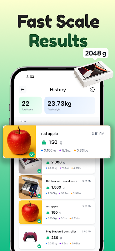 Estimasi Berat Instan: Ambil foto dan dapatkan hasil berat instan dalam gram, ons, pon, atau kilogram dalam hitungan detik.