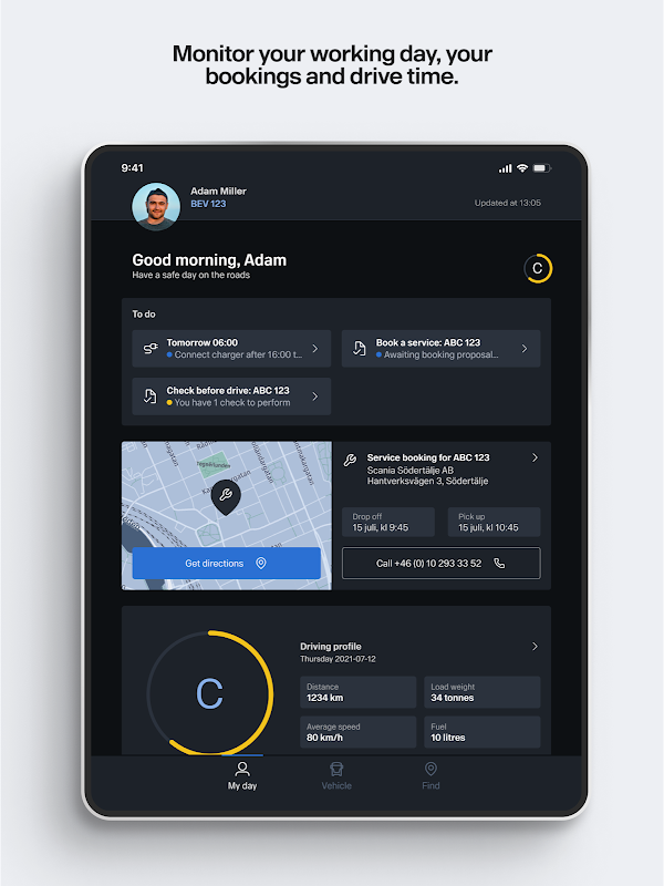 Scania Driver memberi Anda, sebagai pengemudi, akses ke semua informasi yang Anda perlukan untuk perjalanan yang lancar dan aman, langsung di ponsel Anda.