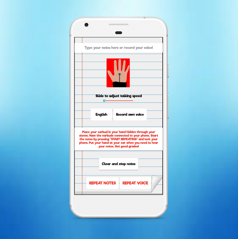 ''School Test Cheat'' is an app designed to make it possible for you to listen to your notes during your tests. Your notes will be repeatily read up in your earbud located in your hand thorugh your sleeve. This will make it very easy for you to remember important answers since you can just put your hidden earbud to your ear and listen to the answer in your notes.