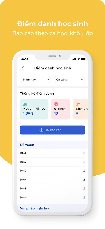 Lihat laporan, statistik kehadiran siswa di seluruh sekolah berdasarkan shift, hari, minggu, bulan