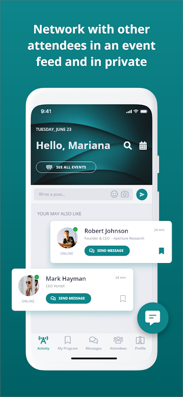 - Network with other attendees in an event feed and in private messages